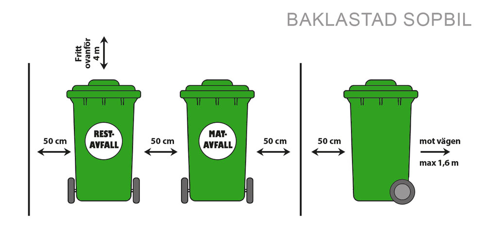 Om du har flera soptunnor ska de placeras med ett mellanrum på minst 50 cm så att sophämtningen kan ske smidigt. De ska stå med handtaget inåt och locket stängt för att undvika spill och lukt.