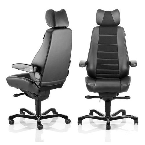 Stolen har svankstöd med luft, uppfällbara armstöd med 30° lutning och ett justerbart nackstöd i svart läder.