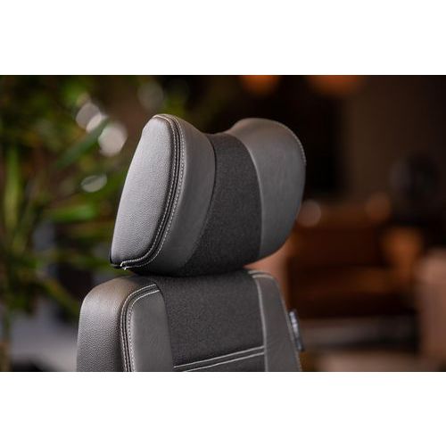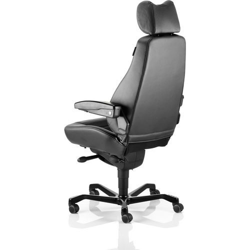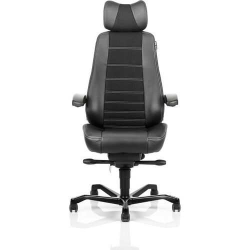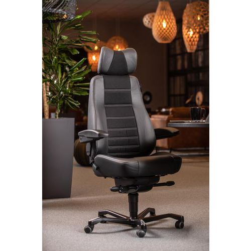 Stolen har svankstöd med luft, uppfällbara armstöd med 30° lutning och ett justerbart nackstöd i svart läder.
