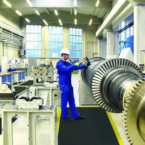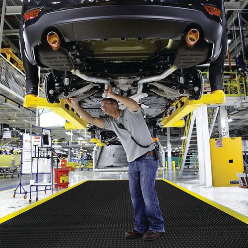 Den 19 mm tjocka plattformen isolerar arbetaren från den hårda marken medan de välvda kupolerna på undersidan gör att mattan kan böjas flexibelt med varje rörelse.