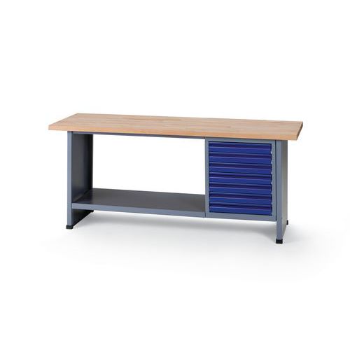 - Arbetsbänk, längd 2000 mm i olika kombinationer. Moduluppbyggda smarta arbetsbänkar. Våra arbetsbänkar har en hög finish och är lackade med en slagtålig, grå pulverlack med hamrad struktur. Luckorna och lådorna är lackade i ljusblå strukturlack. Den 4 cm tjocka bordsskivan är av massiv bok, impregnerad med linolja. Plåten är 2 mm tjock. Skåpen till arbetsbänkarna är låsbara, och lådorna löper på rullager.