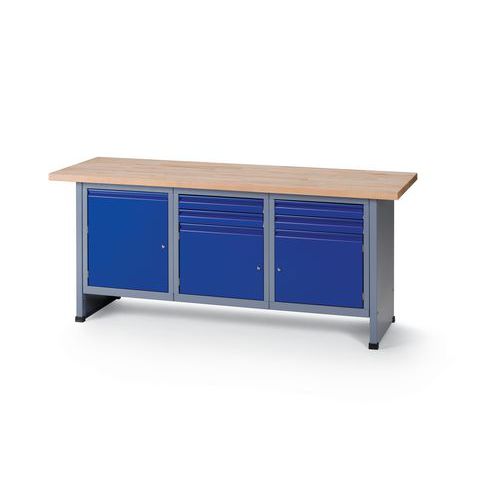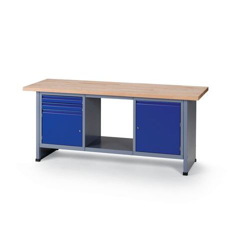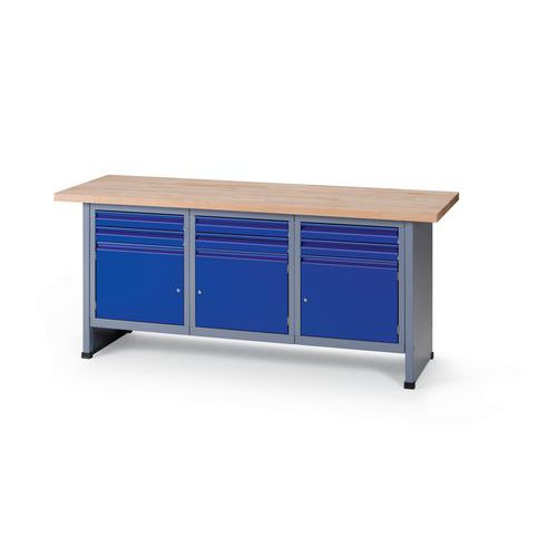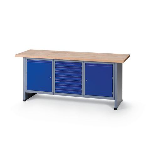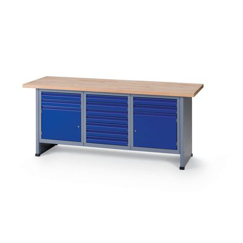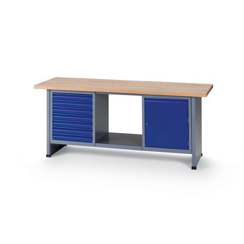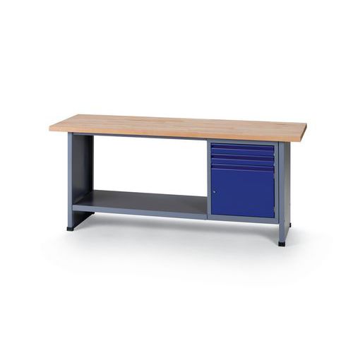 Robust och extra bred arbetsbänk med skiva av massiv bok. Lådorna har rullager och är därmed mycket lätta att öppna och stänga. Dörr med lås för säker förvaring av dina tillhörigheter.