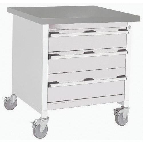 Mycket robust struktur för enkel rengöring av golvet. Vissa modeller kan sitta och arbeta (knäavstånd). Mycket robusta integrerade lådenheter. Belastning per låda: 75 kg, lådor kan öppnas till 100 %. Monobloc-arbetsbänkar med hjul med 125 mm diameter. Maximal belastning: 300 kg.