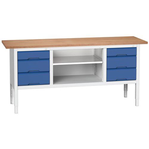 30 mm tjock multiplex-topp. Stålram med integrerade lådor. Upphöjd för enkel rengöring av golvet. Lådor eller dörrlådor. Lagermonterade lådor, 100 % öppning, belastning 60 kg. Flyttbart hyllplan. Lådmått: bredd 443 eller 718 mm, djup 550 mm, höjd 600 mm. Fast modell justerbar från 830 till 930 mm. Rullmodell höjd 930 mm utrustad med hjul med 125 mm diameter. Djup 600 mm Levereras monterad, klar att använda.