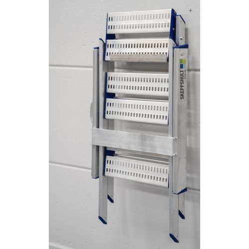 - Arbetstrappan är lätt att ta med sig – den blir platt när den fälls ihop och kan enkelt förflyttas tack vare ett förmonterat handtag.