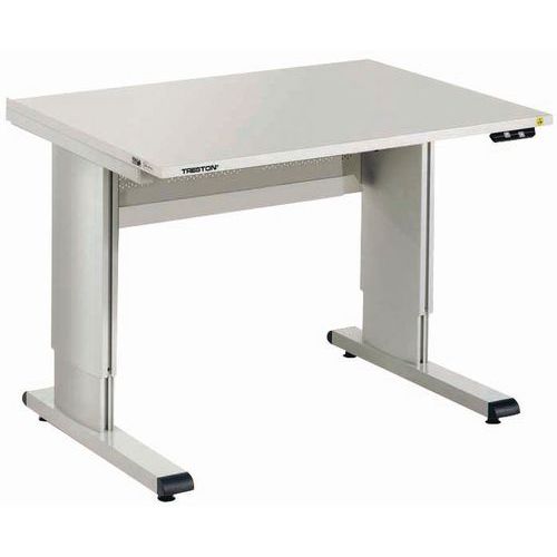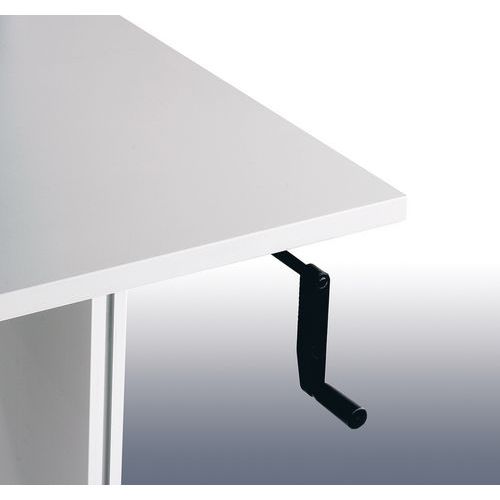 Bordsskivan kan justeras steglöst, antingen elektriskt eller med handvev eller insexnyckel.