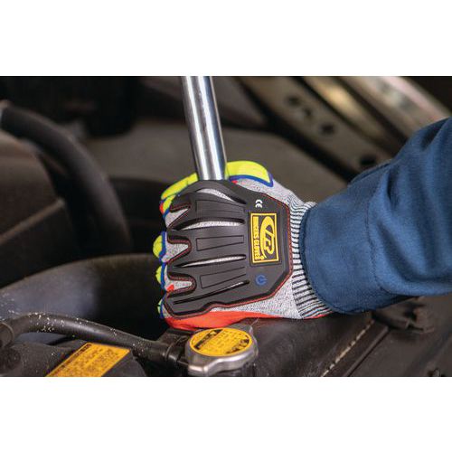 - Stötskydd av termoplastiskt gummi (TPR) på handryggen och längs fingrarnas hela längd.