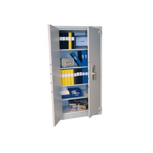 - Bra förvaring av t ex enklare dokument, verktyg, AV-utrustning och tobaksvaror. Ett helsvetsat skåp med dubbla väggar i 3 mm stålplåt. Volym 578 l. Utrustat med två nyckellås med 2 nycklar. Brandisolerade väggar enligt DIN 4102. Lås med borrskyddsplatta i mangan. Regelverket är försett med grova kolvar i framkant och bakkant. 578 l.