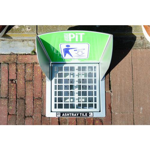 En robust korrosionsbeständig askkoppsplatta i galvaniserat stål med galler för optimal uppsamling av småavfall och cigarettfimpar.