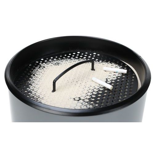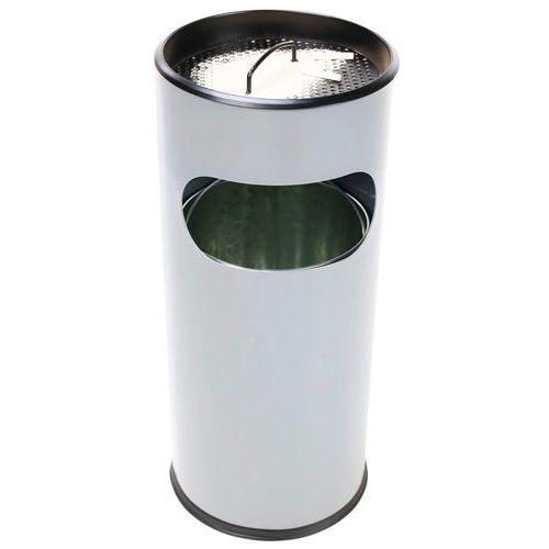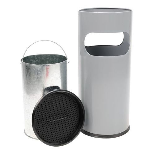 Rund, brandbeständig askkopp/papperskorg med insida av metall. Ovandel av metallnät och en svart panel. Nät för att enkelt fimpa cigaretter. Handtag på toppen för att enkelt tömma behållaren. Garanti : 10 år