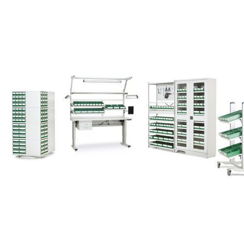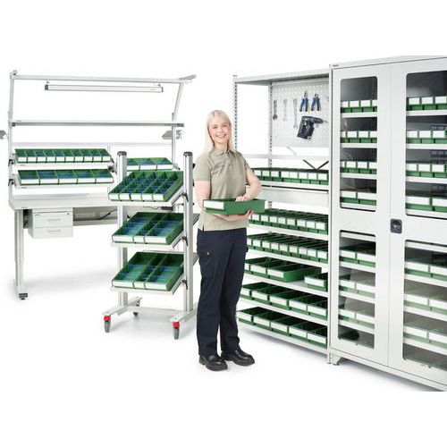 Ett stort urval förvaringslådor för allt från förvaring och hantering av tunga föremål till organisering och användning av mycket små delar och komponenter. Hållbara, handtagsförsedda förvaringslådor som staplas stadigt och har mått enligt det metriska hyllsystemet Plocklådor kan väggmonteras med lådskena eller placeras i ställ på arbetsbordet. De står också stadigt direkt på arbetsbordet och riskerar inte att välta när man sträcker sig efter komponenter.Rundade innerhörn och en specialutformad framkant gör att det går snabbt att plocka delar. Genomskinliga smålådor passar för arbetsbord eller hurtslådor, självhäftande etiketter är standard och avdelare finns som tillbehör Samtliga lådor ovan kan också fås med ESD-skydd.