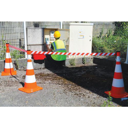 Orange, fluorescerande kon med en bandkassett med ett utdragbart band (50 mm x 3 m) och en mottagare.