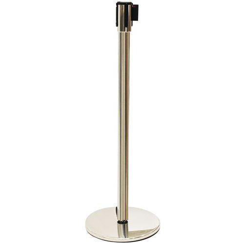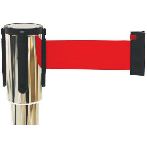 - Stolpe med utdragbart avspärrningsband och 3 fästpunkter. Utdragbar rem med automatiskt bromssystem: dras tillbaka mjukt när den lossas. Sockel med gummifötter ger extra stabilitet.