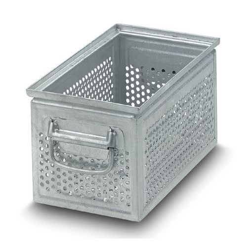 Innehållet är väl synligt genom perforeringen. Mycket god stabilitet tack vare förstärkningslister. Tappar inte formen tack vare den kraftiga stålkonstruktionen. Stapelbar i flera lager. Back avsedd för transport av metall.