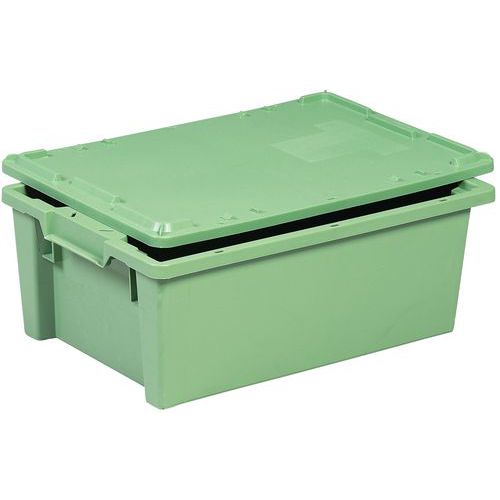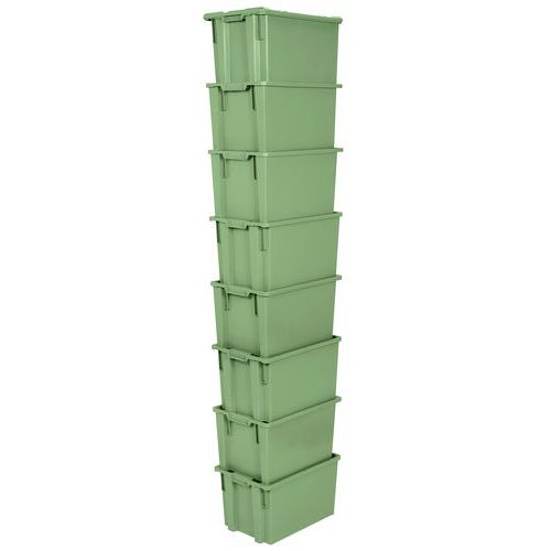 Back Tellus med tät botten och täta sidor. Trav- och stapelbara backar- lämpliga för att distribuera varor i många olika branscher. Backarna optimerar utrymmesanvändningen när de är staplade för distribution och upptar 70% mindre utrymme när de travas för återsändning eller lagring. Maximal last (kg) : 25 Kök