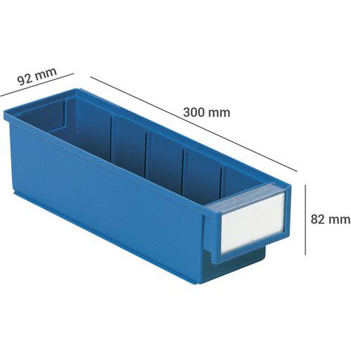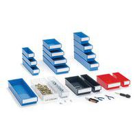 Lagerlådorna är utformade för att passa alla vanliga metriska hyllor, paternoster och industriella arbetsstationer. Lådor av samma bredd staplas säkert, även om de är av olika djup. Raka väggar säkerställer en effektiv användning av utrymmet. Färgalternativen gör att ett lagringssystem kan utformas för att uppfylla kundens krav. De glasklara backarna är genomskinliga, vilket möjliggör enkel visuell identifiering. Till varje låda ingår det etikett och etikettskydd. Material: PS = transparent polystyren, användningstemperatur från -4 °C till +55 °C. PP = färgad polypropen, användningstemperatur från -2 °C till +75 °C. Beständig mot oljor och de flesta syror och lösningsmedel.