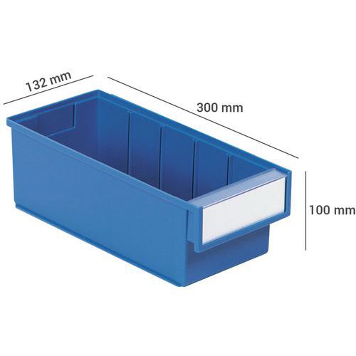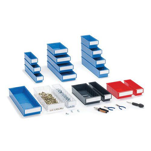 Lagerlådorna är utformade för att passa alla vanliga metriska hyllor, paternoster och industriella arbetsstationer. Lådor av samma bredd staplas säkert, även om de är av olika djup. Raka väggar säkerställer en effektiv användning av utrymmet. Färgalternativen gör att ett lagringssystem kan utformas för att uppfylla kundens krav. De glasklara backarna är genomskinliga, vilket möjliggör enkel visuell identifiering. Till varje låda ingår det etikett och etikettskydd. Material: PS = transparent polystyren, användningstemperatur från -4 °C till +55 °C. PP = färgad polypropen, användningstemperatur från -2 °C till +75 °C. Beständig mot oljor och de flesta syror och lösningsmedel.