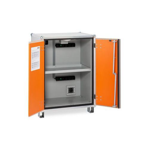 Skåpet ger tidig varning vid skador på litiumbatterier och följer alla relevanta säkerhetsföreskrifter för laddning av sådana batterier.
