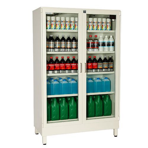 - Vårt utrymmesmässigt mest generösa brandavskiljande skåp för lagstadgad förvaring av brandfarliga vätskor. Brandklass: SP 2369, Klass 1. Godkänt av SP för förvaring av ca 386 st 1 liters PET flaskor, 14 st 25 liters dunkar. Skåpet flyttas enkelt med handtruck. Glasdörr för butiksexponering. Dagöppning 1540 x (500 x 2) mm.