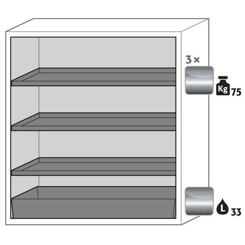 Säkerhetsförvaringsskåp S-CLASSIC-90. Säker och godkänd lagring av brandfarliga ämnen i arbetsomgivningar. Funktion-konstruktion: Robust konstruktion och lång livslängd: dörr med tre gångjärn, stomme av pulverlackerad stålplåt, säkerhetselement monterade utanför skåpet för ökat skydd mot korrosion. Ingen obehörig användning: dörrar låsbara med profilcylinder (integrering i befintligt låssystem möjligt). Enkel justering: justeringshjälp för att kompensera för ojämnt golv. Ventilation: integrerade luftkanaler redo för anslutning (DN 75) till ett tekniskt avgassystem. Tillverkad i Tyskland Maximal last (kg) : 600 Garanti : 5 år