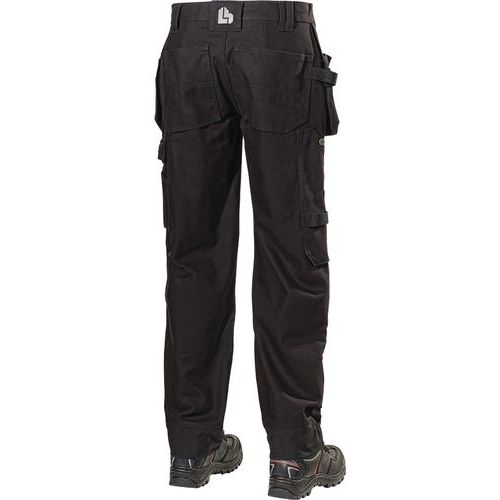 Två hängfickor, två framfickor samt två bakfickor. Invändiga knäskyddsfickor i två höjdlägen. Knivhälla, benficka med lock, två fickor för mobiltelefon, tumstocksficka, pennficka samt hammarhank. ID-kortsficka.