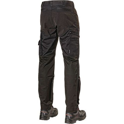 Två framfickor. Infällda stolpfickor bak. Höger ben med knivhållare och tumstocksficka med pennfickor. Benficka med dragkedja och invändig telefonficka och utvändig vinklad telefonficka försedd med magnetlås.