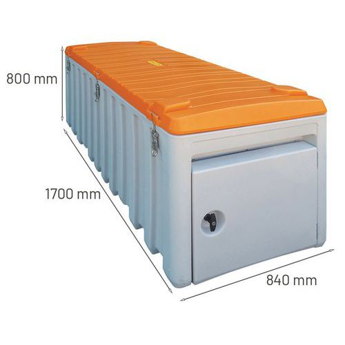 | Varunamn | CEMbox transportlåda med lucka, Volym: 750 L, Total höjd: 800 mm, Total bredd: 840 mm, Längd totalt: 1700 mm |