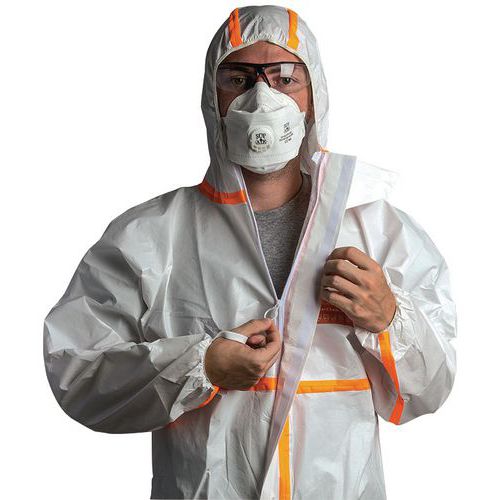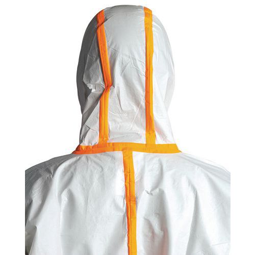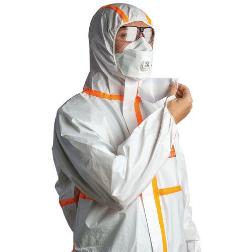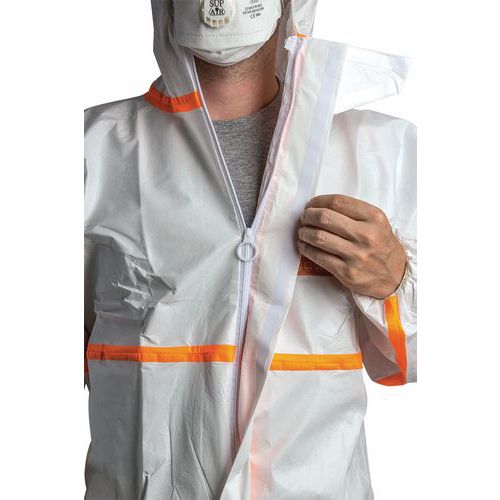 Kostym för effektivt skydd mot radioaktiva föroreningar i partikelform. Sydda sömmar, övertejpade med en orange värmefixerad remsa för maximalt skydd. Kvarhållande resår i underbenen och ärmarna för att förhindra att kläderna åker upp när bäraren rör sig. Resår i midjan, manschetter och vrister. Dragkedja med självhäftande lock. Silikonfri antistatisk dräkt. Tillverkad av laminerad mikroporös folie. Elastisk tredelad huva. Hakband.