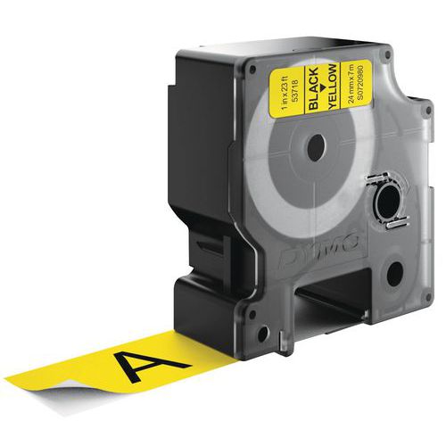 - Dymo D1 självhäftande polyestertejpkassett, extremt hållbar baksida.