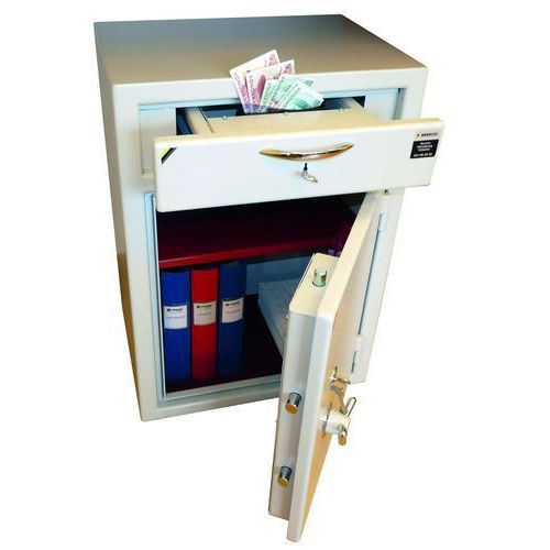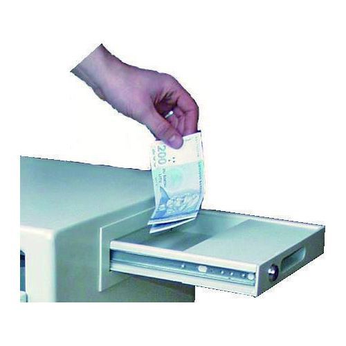 - Robust konstruktion i 4 mm stålplåt förberett för fastbultning i botten eller i vägg. Som standard är deponeringslådan och dörren utrustade med säkerhetslås med 2 nycklar. Maximal storlek för deponering: H x B x D: 80 x 244 x 160 mm.