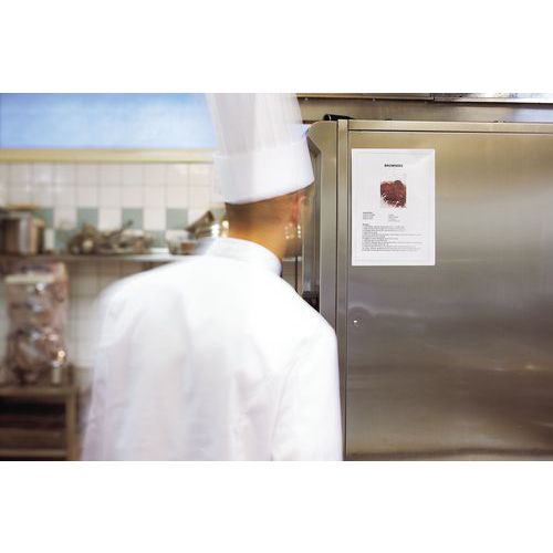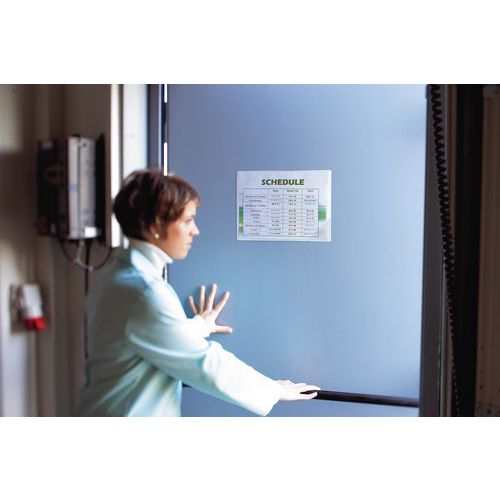 Magnetisk, fäster på alla metallytor utan skruvar eller verktyg. Öppning på båda sidor för enkel isättning av dokument. Använd stående/liggande. Skyltlösning för användning på maskiner, dörrar, metallskivor, kylskåp? PVC-ficka med magnetisk baksida. Har plats för 10 ark à 80 g. Helgrön bakgrund.