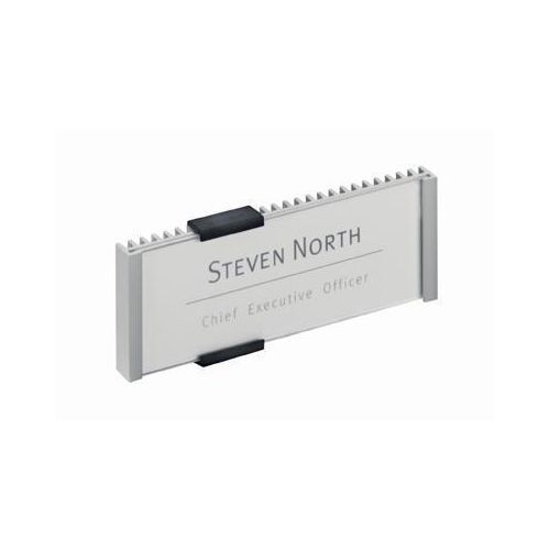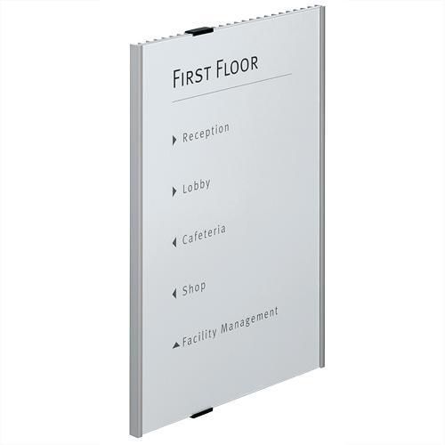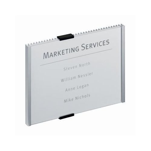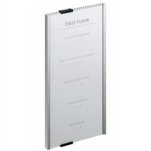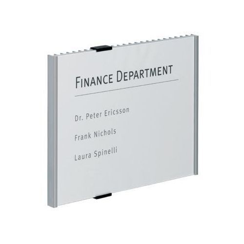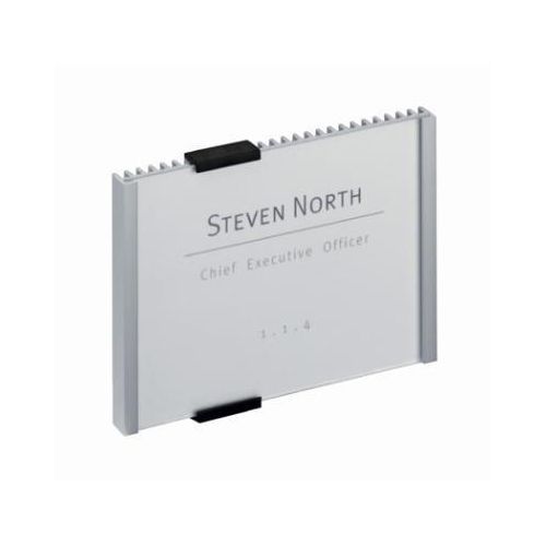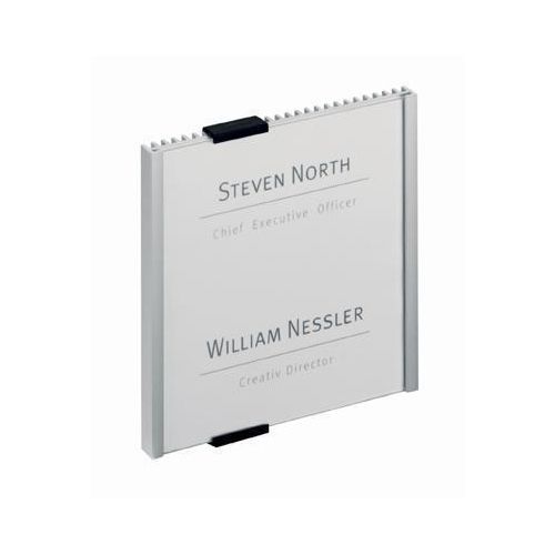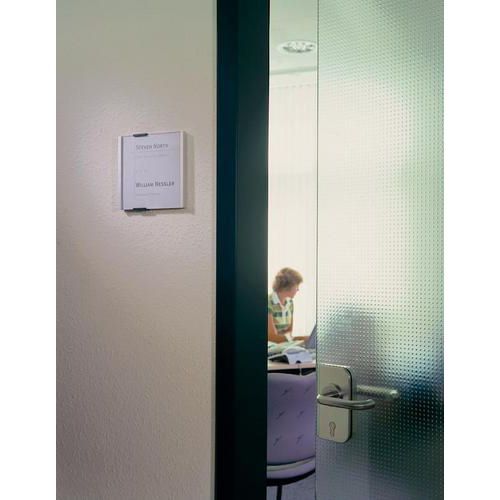 - Dörrskylt i aluminium som fästs med bifogade självhäftande fästkuddar eller skruvar.