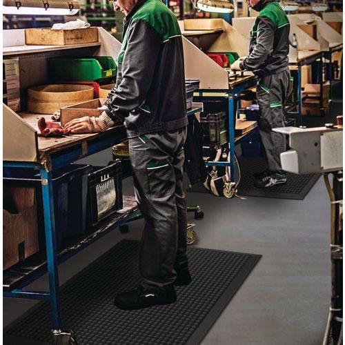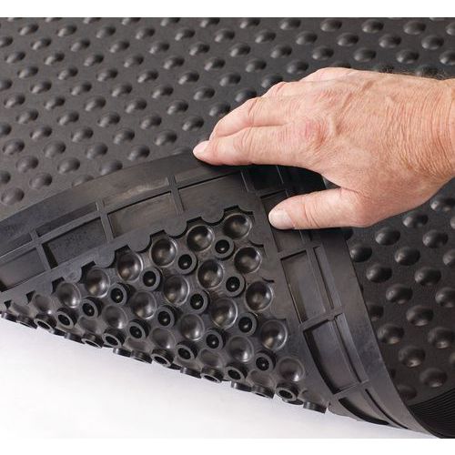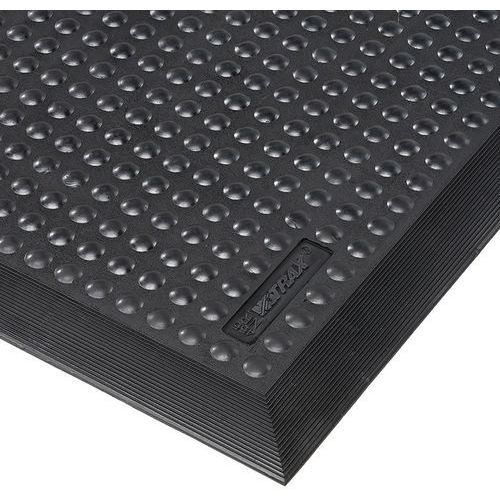 Enkel gummiavlastningsmatta för alla allmänna applikationer. Halkskyddade egenskaper: utformad för att gripa mot marken och förhindra glidning. Mycket bekväm med ergonomisk bubbelyta som motverkar trötthet. Halkskyddsklassificering R9 enligt standarden DIN51130 och BG BGR181-regeln. Fri från skadliga och giftiga ämnen såsom DOP, DMF, ozonskadliga ämnen, silikon och tungmetaller.