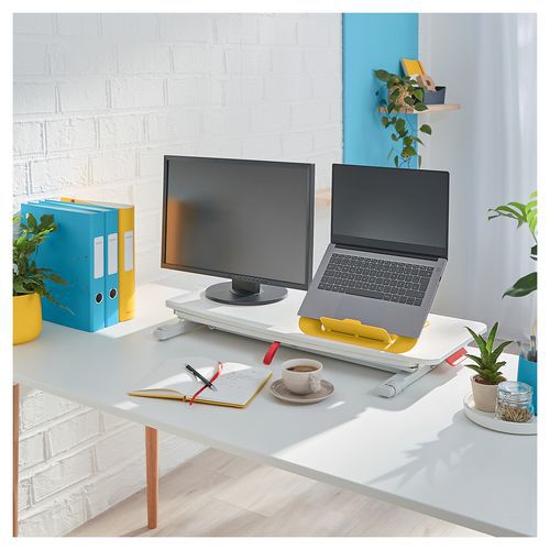Med sina kompakta mått på 800 x 420 mm sparar det plats samtidigt som det rymmer både bildskärm och laptop på huvudytan.