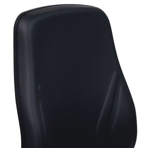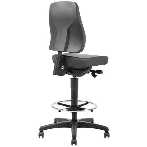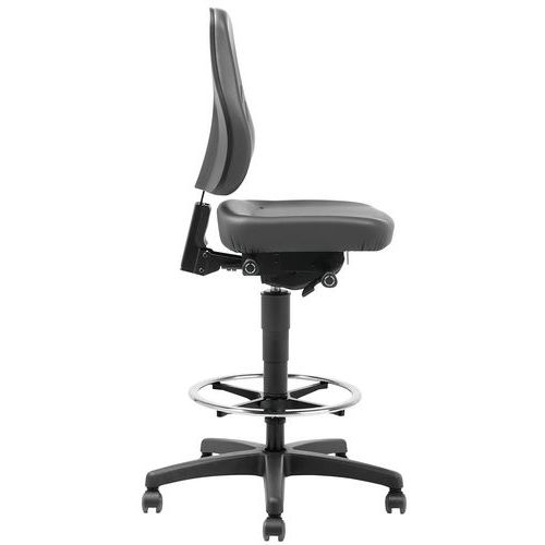 | Varunamn | Verkstadsstol med hög rygg och fotstöd, Armstöd: nej, Typ av fot: Hjul, Sits, material: Konstläder |