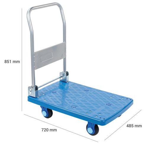 | Varunamn | Flakvagn i plast med nedfällbart handtag, 200 kg, Kapacitet: 200 kg, Total höjd: 851 mm, Total bredd: 485 mm |