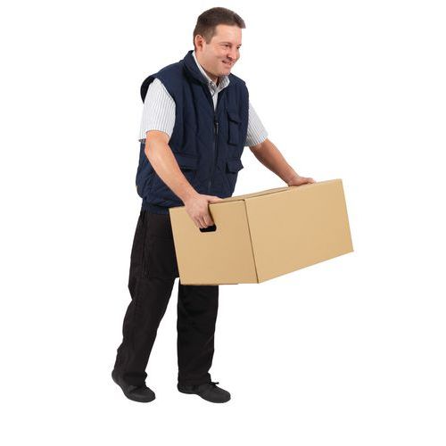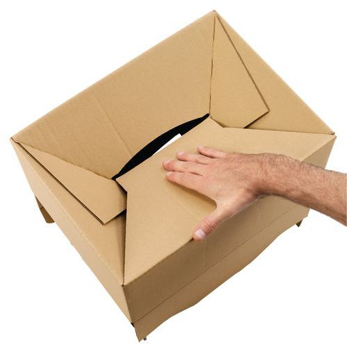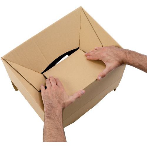 Flyttkartong med förslutningsbart lock, för säker transport av innehållet. Stabil transport på lastpall. Dubbel tjocklek i botten. Snabb förslutning. Låda med sidohantag. Halvautomatisk kartongförslutning. Tillverkat av 67 % returpapper och 33 % kraftpapper av sågverksavfall.