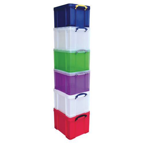 Ogenomskinligt material skyddar innehållet från insyn. Helförstärkt så att den tål belastning bättre och inte går sönder vid stapling. Kan staplas med eller utan lock och med backar av samma storlek. Konstant skydd mot damm och fukt. Stora handtag underlättar transport. Tillverkad i Storbritannien Maximal last (kg) : 80 kg Garanti : 3 år