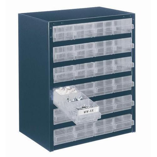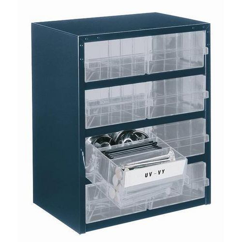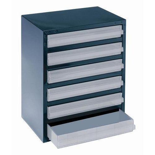 - Förvaringsskåp/lådmagasin, tillverkat i lackerat stål och levereras med lådor i polypropen – beständiga mot olja, syra och baser.