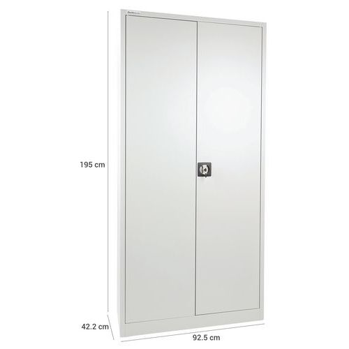 Förvaringsskåp av metall, höjd 195 cm, med robust konstruktion och slagdörrar.