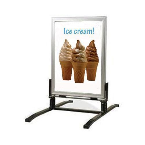 Konstruktionen gör det enkelt att byta budskap - öppna sidoprofilerna, placera in affisch och frontplast i spåret mellan ryggen och bottenskylten, stäng profilerna.