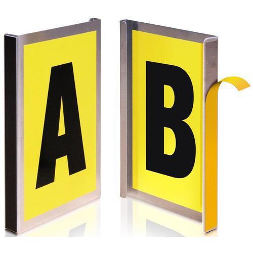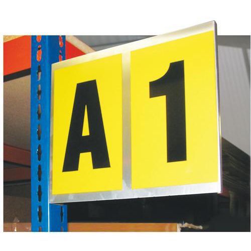 Gavelskylt som levereras med självhäftande tejp eller med magnetfunktion. Finns i två versioner – med plats för ett eller två tecken. Självhäftande tecken beställs separat, artikelnummer 51195-x, där x motsvarar 0-9 eller A-Z.