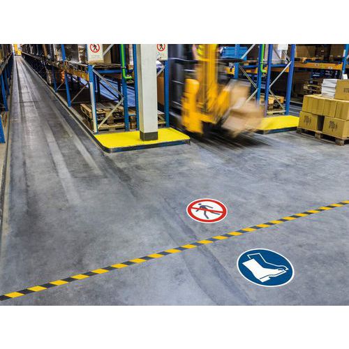 Självhäftande randig markeringstejp för inomhusbruk. Används för permanent markering av riskområden som behöver uppmärksammas t ex trafikzoner och spärrområden. Fäster på rena och torra betonggolv. Halkskyddsgrad R9 i enlighet med DIN51130. Klarar trucktrafik - undantaget vrid och bromsrörelser av trucken direkt på tejpen. Tillverkad i Storbritannien