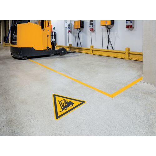 Självhäftande, extra stark markeringstejp för inomhusbruk. Används för permanent markering av områden som behöver uppmärksammas t ex trafikzoner och spärrområden. Fäster på rena och torra betonggolv. Slitstark och tålig med halkskyddsgrad R10 i enlighet med DIN51130. Avfasade kanter. Klarar trucktrafik - undantaget vrid och bromsrörelser av trucken direkt på tejpen.
