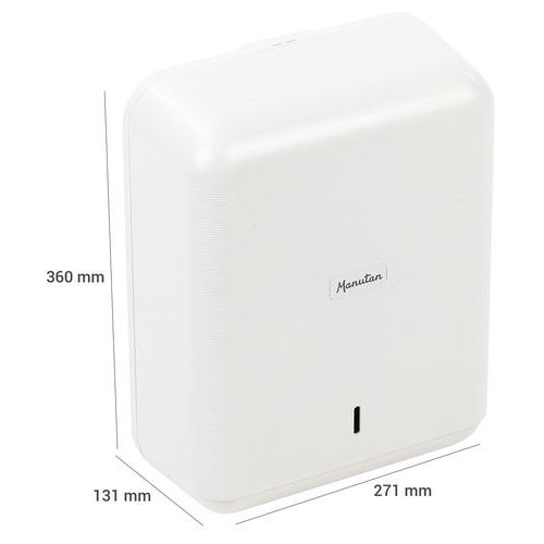 | Varunamn | Handduksdispenser, Färg: Vit, Höjd: 360 mm, Bredd: 271 mm, Djup: 131 mm, Kapacitet (Antal handdukar): 600 |