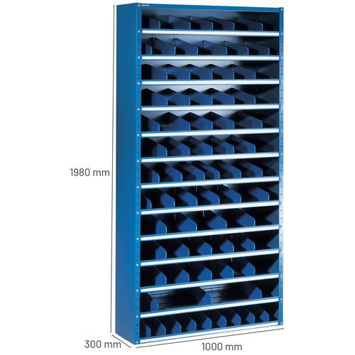 | Varunamn | Hög förvaringshylla med fack, Material: Stål, Total höjd: 1980 mm, Total bredd: 1000 mm, Totalt djup: 300 mm |