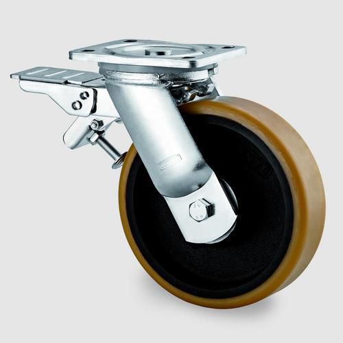- Dubbelverkande broms som låser både hjul och svängkrans. Användningsområde: Tung godshantering.