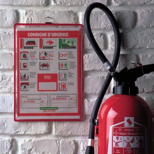 - För säkerhetsföreskrifter, instruktioner, telefonlistor, m.m. Kan hängas liggande eller stående på vägg. Röd ram. Ej avsedd för panelställ. Med upphängningsögla.