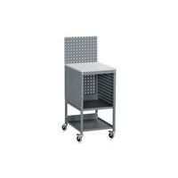- Bänken har en låg perforerad plåt för praktisk verktygsförvaring och är utrustad med två fasta hjul samt två svängbara hjul med bromsar för säker positionering.