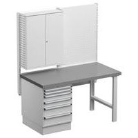 - Bänken finns med höjdjusterbara ben, perforerade plåtar och verktygsskåp för effektiv verktygsförvaring.
